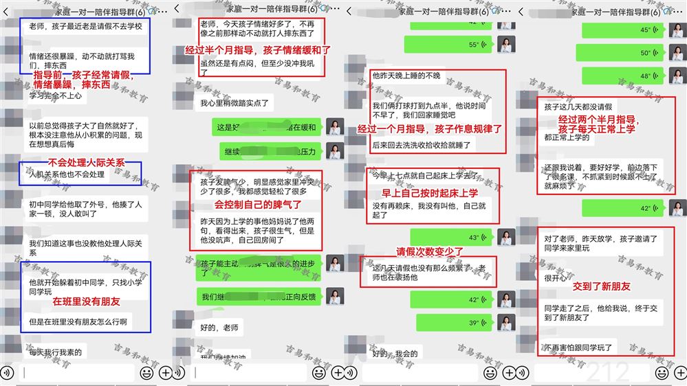 经过两个半月指导,孩子每天正常上学,不再请假,人际关系也变得积极,不再躲避同学圈。