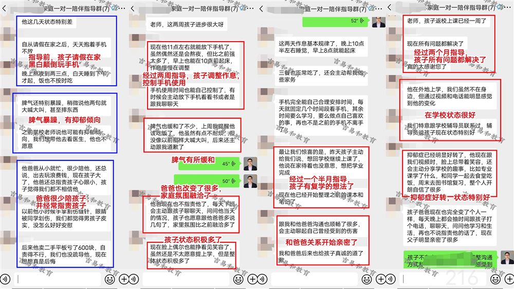 经过两周指导,孩子沉迷手机的问题明显改善,黑白颠倒的现象逐渐减少,自己能控制使用时间,抑郁倾向也有所减轻,整个人的状态积极多了。