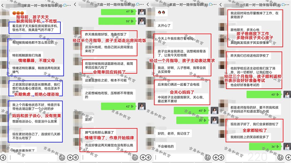 经过半个月指导,孩子开始愿意简单回应父母的关心,并主动走出房间吃饭,作息逐渐规律,情绪变得平稳,不再轻易暴躁。